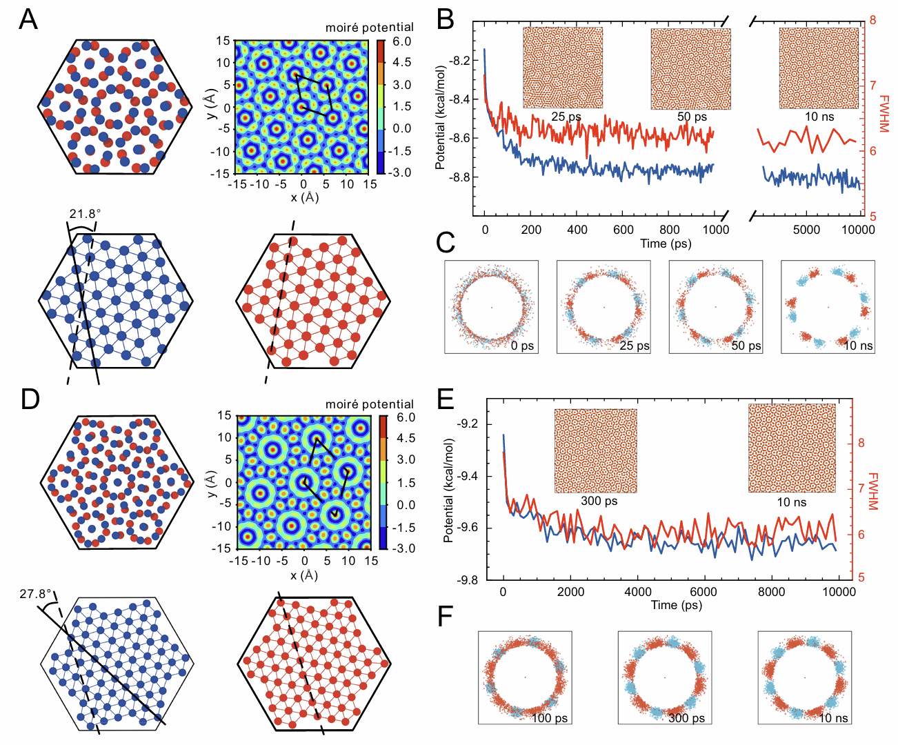 扭转双层范德华材料凭借其独特的摩尔超晶格效应,展现出奇特的物理特性,已成为量子器件设计的核心。传统研究集中于范德华材料体系,而这类体系需要人工精确堆叠才能实现电子态调控。水是地球上最丰富的物质之一,可以形成丰富的物质形态,属于非范德华材料,然而人类对其结构的认识还很有限,因此被科学杂志列为125个关键科学问题之一。在这种氢键主导的结构中能否形成稳定扭转结构,一直是未被探索的空白。江苏大学唐淳教授、王丽雅副教授团队与香港城市大学曾晓成教授团队合作,首次发现在纳米受限环境中可自发形成具有摩尔超晶格的扭转双层冰(Twisted Bilayer Ice, TBI)。与需要人工扭转的范德华材料不同,扭转双层冰的两种稳定扭转构型(21.8°和27.8°扭转角)的形成依赖于氢键网络的结构自适应能力,为氢键摩尔材料的研究打开了新窗户。