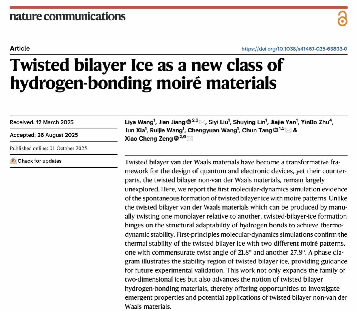 近日,我院微纳米力学团队唐淳教授-王丽雅副教授与香港城市大学曾晓成教授团队合作,发现氢键主导的非范德华摩尔材料:魔角双层冰,在国际顶尖期刊Nature Communications上发表题为Twisted bilayer ice as a new class of hydrogen-bonding moiré materials 的论文。江苏大学为第一完成单位,江苏大学王丽雅副教授为论文第一作者,香港城市大学江健博士、江苏大学唐淳教授和香港城市大学曾晓成教授为共同通讯作者。