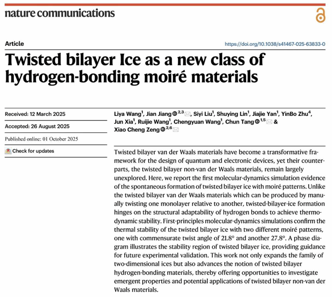 Recently, the research team of nano mechanics in the Faculty of Civil Engineering and Mechanics at Jiangsu University, led by Professor Tang Chun and Associate Professor Wang Liya, and in collaboration with Professor Zeng Xiao Cheng’s group from the City University of Hong Kong, discovered a new class of non-van der Waals moiré material: magic-angle twisted bilayer ice (TBI) which is dominated by the hydrogen-bond network. Their research result was published in the prestigious journal Nature Communications, titled "Twisted bilayer ice as a new class of hydrogen-bonding moiré materials." Jiangsu University is the primary completion institution, with Associate Professor Wang Liya as the first author of the paper, Dr. Jiang Jian from the City University of Hong Kong, Professor Tang Chun from Jiangsu University, and Professor Zeng Xiao Cheng from the City University of Hong Kong are co-corresponding authors.