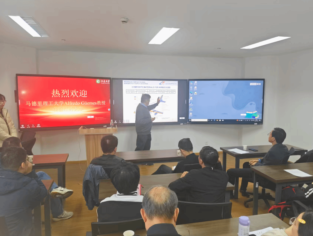 11月26日上午10:00,西班牙马德里理工大学(Universidad Politécnica de Madrid, UPM)Alfredo Güeme教授受邀在江苏大学土木工程与力学学院1001会议室,作题为“西班牙航空复合材料研究进展”的高水平学术报告。学院共50余名师生齐聚现场,与这位国际结构健康监测领域的权威专家深入交流,共享学术盛宴。
